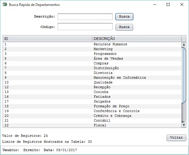 E a tela que eu quero que preencha com o ID e a Descrição do Departamento.