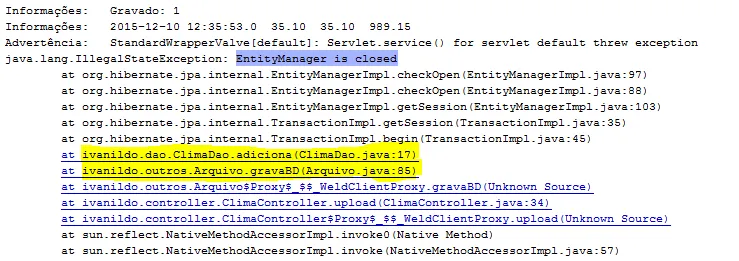 Boa noite galera !! Estou com um problema na minha aplicação que não estou conseguindo resolver…Estou utilizando VRaptor mais Hibernate/JPA, e sempre quando vou gravar algo no Banco de Dados apenas o primeiro registro é gravado e a partir do segundo da erro: “EntityManager is closed”. Já pesquisei em vários fóruns sobre esse problema mas ainda não consegui resolver, alguém aí poderia me ajudar ?? Grato !! Segue abaixo mais informações