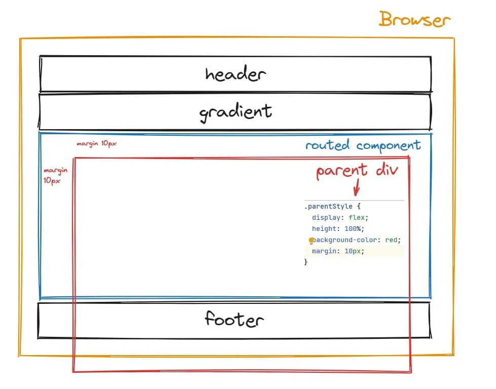 Eu tenho os seguintes componentes em React, um header e um componente gradient, um componente que é “roteado” (em azul) e um footer (figura 1).