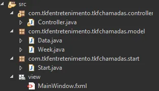 Olá. Eu criei uma aplicação JavaFX. Meu objetivo era apresentar ela hoje. Está tudo pronto e funcionando direitinho. Essa é a estrutura do projeto: