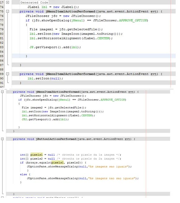 Galera fiz o programa abaixo que o usuário coloca suas imagens através do barra de menu até ai tudo certo, agr nao consigo programar o botao calcular para comparar se a imagens sao iguais poderia me ajudar plixxx??