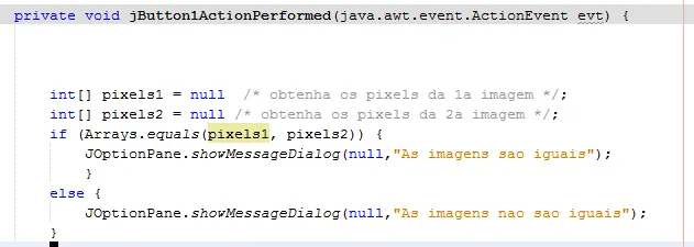 no seu código, pixels1 e pixels2 são null , portanto sempre serão iguais.