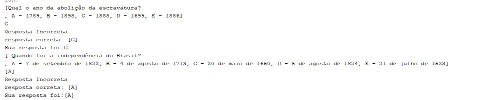 pergunta[0] = "Qual o ano da abolição da escravatura?\n";//Enunciado (C)