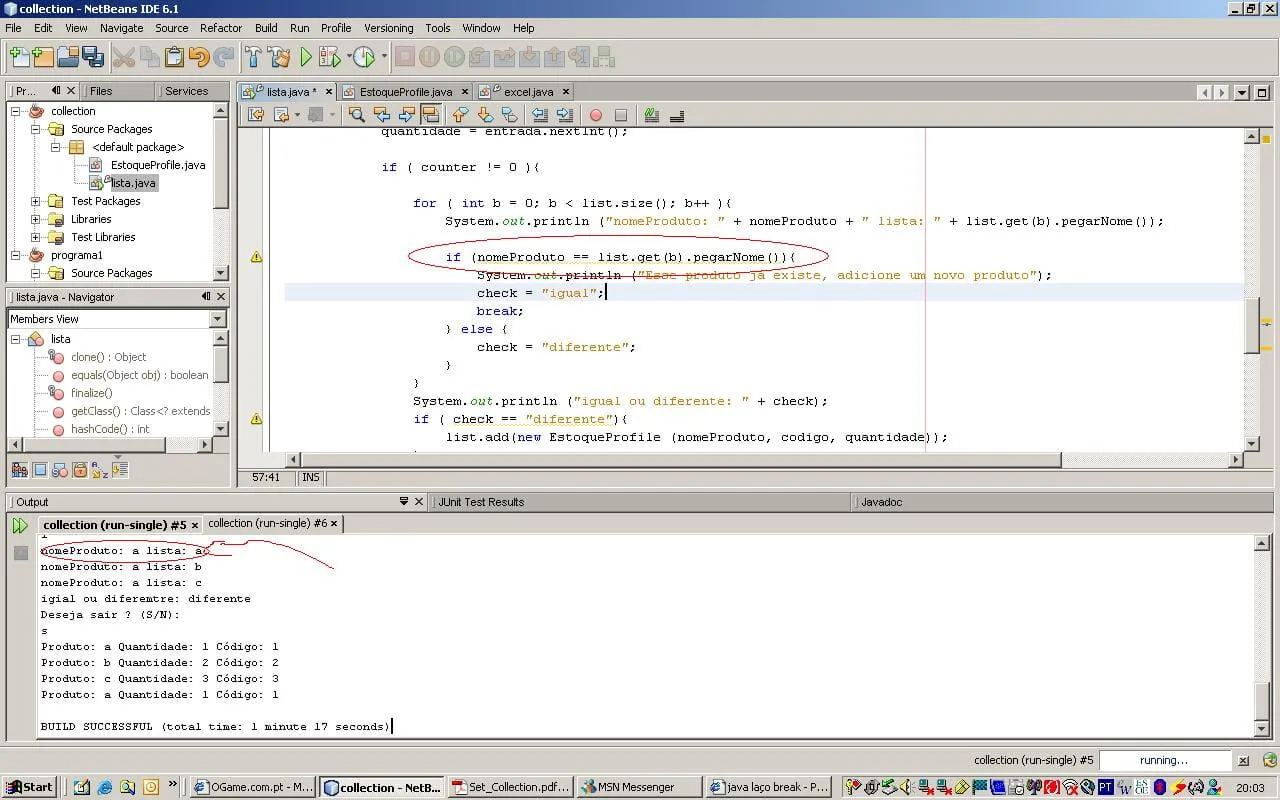 No exemplo da figura, entrei com o valor “a” para a variável nomeProduto e comparei com o valor de retorno da lista (list.get(b).pegarNome() ) que no caso foi “a”. O problema é que essa droga não entra na condição verdadeira se nomeProduto for igual a …PegarNome(), e juro que não sei porque …