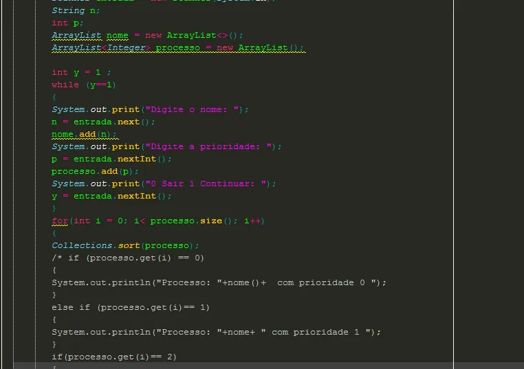 Desenvolvi esse algoritmo para simular o escalonamento de processos por prioridade, onde as prioridades vão de 0 a 5 e precisam ser exibidas em sequencia. Porém, não consigo relacionar o Arraylist processo com o Arraylist nome ( nome do processo)