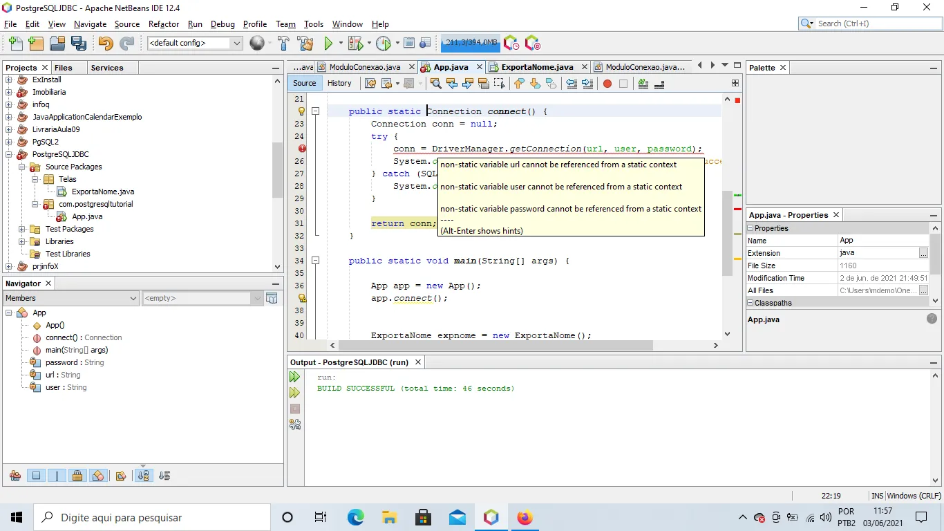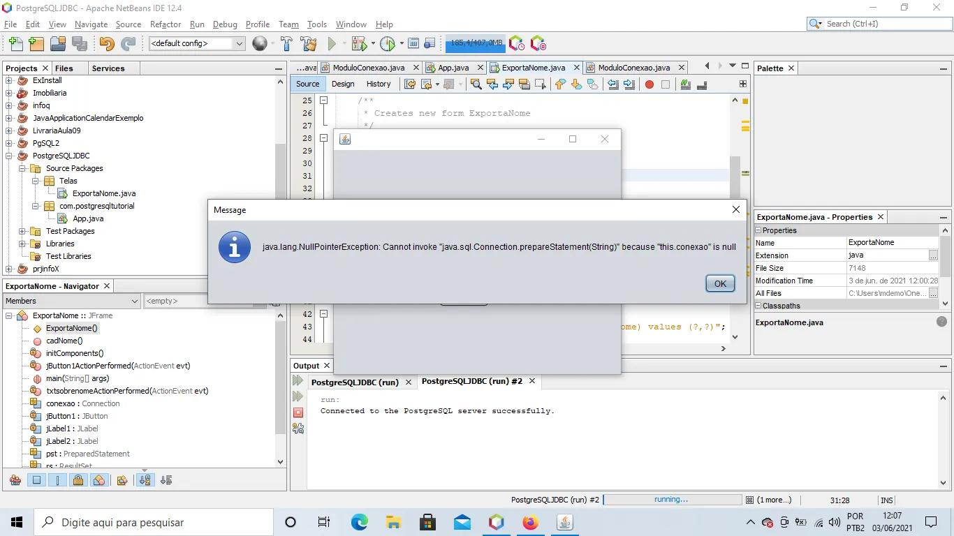daí vi que o comando rs = pst.executeQuery(), no método cadNome na classe ExportaNome estava incorreto.