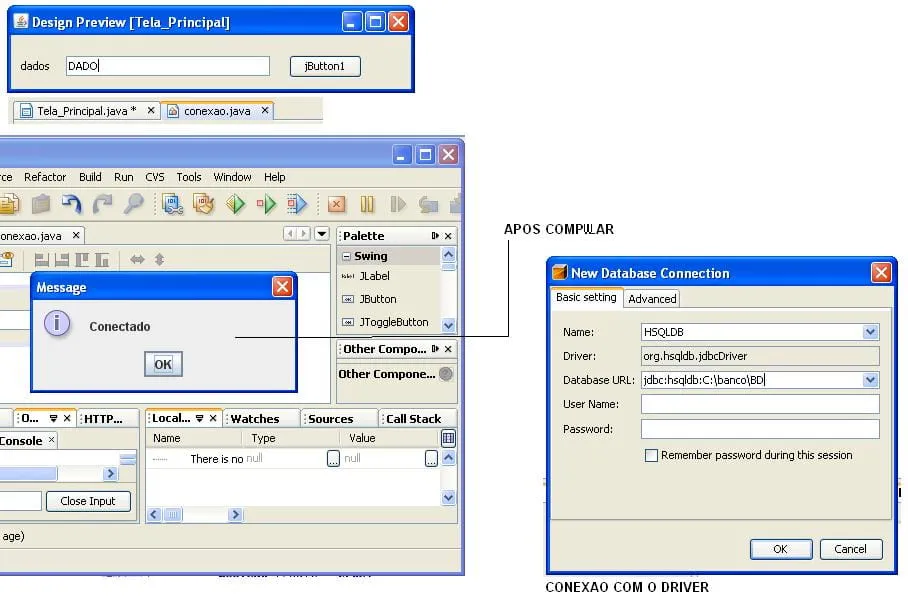 bom é o seguinte fiz um formulario basico no netbens e adicionei o driver do hsqldb criei o conexao.java e efetuei a conexao conforme abaixo [/b]