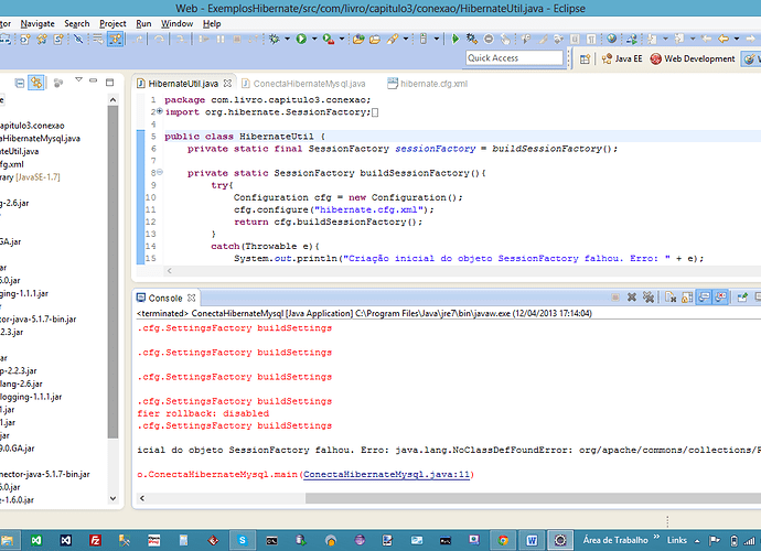 Exception in thread “main”[color=#444444] Criação inicial do objeto SessionFactory falhou. Erro: java.lang.NoClassDefFoundError: org/apache/commons/collections/ReferenceMap[/color]