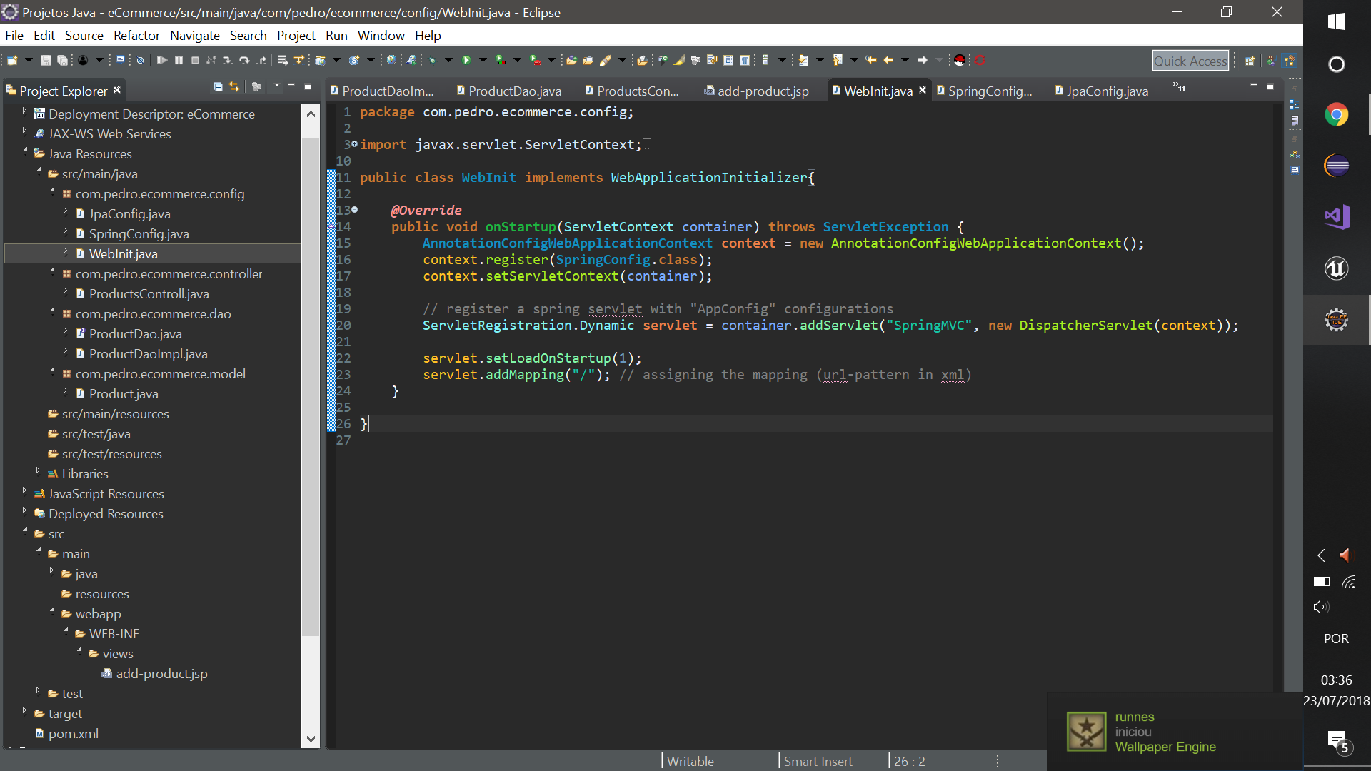 Pessoal, estou desenvolvendo meu primeiro projeto web maven e estou tendo muita dificuldade com a parte de configuração do spring + jpa. Estou utilizando arquivos de configuração por anotações, quando inicializo o server parece estar tudo certo, mas quando tento adicionar algo usando “entityManager.persist” da erro. Se alguem com mais experiencia conseguir identificar onde ta o erro agradeço mt, tbm aceito sugestões de artigos que ajudem nessa parte de configuração do projeto.