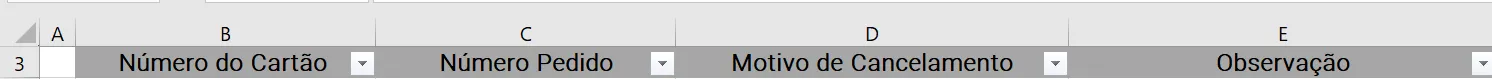 b3=Número do Cartão ,c3= Número do Pedido ,d3= Motivo do Cancelamento ,e3 = Observação