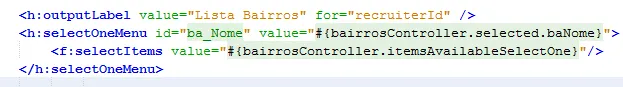 privateBairroscurrent;privateDataModelitems=null;[ARROBA]EJBprivatepct_java2up.BairrosFacadeejbFacade;privatePaginationHelperpagination;privateintselectedItemIndex;publicBairrosController(){}publicBairrosgetSelected(){if(current==null){current=newBairros();selectedItemIndex=-1;}returncurrent;}privateBairrosFacadegetFacade(){returnejbFacade;}publicPaginationHelpergetPagination(){if(pagination==null){pagination=newPaginationHelper(10){[ARROBA]OverridepublicintgetItemsCount(){returngetFacade().count();}[ARROBA]OverridepublicDataModelcreatePageDataModel(){returnnewListDataModel(getFacade().findRange(newint[]{getPageFirstItem(),getPageFirstItem()+getPageSize()}));}};}returnpagination;}publicStringprepareList(){recreateModel();return"List";}publicStringprepareView(){current=(Bairros)getItems().getRowData();selectedItemIndex=pagination.getPageFirstItem()+getItems().getRowIndex();return"View";}publicStringprepareCreate(){current=newBairros();selectedItemIndex=-1;return"Create";}publicStringcreate(){try{getFacade().create(current);JsfUtil.addSuccessMessage(ResourceBundle.getBundle("/Bundle").getString("BairrosCreated"));returnprepareCreate();}catch(Exceptione){JsfUtil.addErrorMessage(e,ResourceBundle.getBundle("/Bundle").getString("PersistenceErrorOccured"));returnnull;}}publicStringprepareEdit(){current=(Bairros)getItems().getRowData();selectedItemIndex=pagination.getPageFirstItem()+getItems().getRowIndex();return"Edit";}publicStringupdate(){try{getFacade().edit(current);JsfUtil.addSuccessMessage(ResourceBundle.getBundle("/Bundle").getString("BairrosUpdated"));return"View";}catch(Exceptione){JsfUtil.addErrorMessage(e,ResourceBundle.getBundle("/Bundle").getString("PersistenceErrorOccured"));returnnull;}}publicStringdestroy(){current=(Bairros)getItems().getRowData();selectedItemIndex=pagination.getPageFirstItem()+getItems().getRowIndex();performDestroy();recreatePagination();recreateModel();return"List";}publicStringdestroyAndView(){performDestroy();recreateModel();updateCurrentItem();if(selectedItemIndex>=0){return"View";}else{// all items were removed - go back to listrecreateModel();return"List";}}privatevoidperformDestroy(){try{getFacade().remove(current);JsfUtil.addSuccessMessage(ResourceBundle.getBundle("/Bundle").getString("BairrosDeleted"));}catch(Exceptione){JsfUtil.addErrorMessage(e,ResourceBundle.getBundle("/Bundle").getString("PersistenceErrorOccured"));}}privatevoidupdateCurrentItem(){intcount=getFacade().count();if(selectedItemIndex>=count){// selected index cannot be bigger than number of items:selectedItemIndex=count-1;// go to previous page if last page disappeared:if(pagination.getPageFirstItem()>=count){pagination.previousPage();}}if(selectedItemIndex>=0){current=getFacade().findRange(newint[]{selectedItemIndex,selectedItemIndex+1}).get(0);}}publicDataModelgetItems(){if(items==null){items=getPagination().createPageDataModel();}returnitems;}privatevoidrecreateModel(){items=null;}privatevoidrecreatePagination(){pagination=null;}publicStringnext(){getPagination().nextPage();recreateModel();return"List";}publicStringprevious(){getPagination().previousPage();recreateModel();return"List";}publicSelectItem[]getItemsAvailableSelectMany(){returnJsfUtil.getSelectItems(ejbFacade.findAll(),false);}publicSelectItem[]getItemsAvailableSelectOne(){returnJsfUtil.getSelectItems(ejbFacade.findAll(),true);}publicBairrosgetBairros(java.lang.Integerid){returnejbFacade.find(id);}[ARROBA]FacesConverter(forClass=Bairros.class)publicstaticclassBairrosControllerConverterimplementsConverter{[ARROBA]OverridepublicObjectgetAsObject(FacesContextfacesContext,UIComponentcomponent,Stringvalue){if(value==null||value.length()==0){returnnull;}BairrosControllercontroller=(BairrosController)facesContext.getApplication().getELResolver().getValue(facesContext.getELContext(),null,"bairrosController");returncontroller.getBairros(getKey(value));}java.lang.IntegergetKey(Stringvalue){java.lang.Integerkey;key=Integer.valueOf(value);returnkey;}StringgetStringKey(java.lang.Integervalue){StringBuildersb=newStringBuilder();sb.append(value);returnsb.toString();}[ARROBA]OverridepublicStringgetAsString(FacesContextfacesContext,UIComponentcomponent,Objectobject){if(object==null){returnnull;}if(objectinstanceofBairros){Bairroso=(Bairros)object;returngetStringKey(o.getBaId());}else{thrownewIllegalArgumentException("object "+object+" is of type "+object.getClass().getName()+"; expected type: "+Bairros.class.getName());}}}