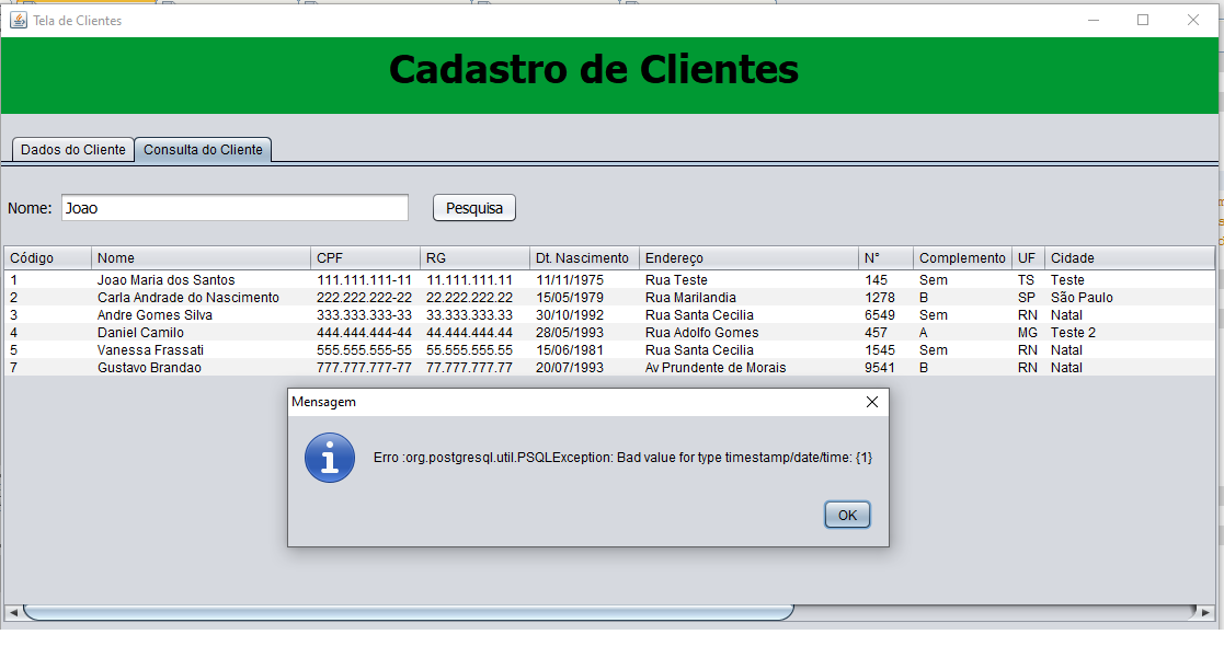 preencherTabela(“select codigo_cliente, nome, cpf, rg, to_char(data_nascimento, ‘DD/MM/YYYY’), endereco, num_endereco, complemento,”