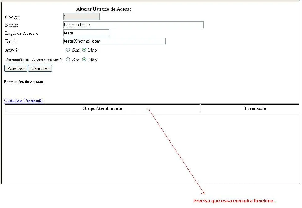 [color=blue]* Usuario 1:N -> PermissaoAcesso <- N:1 GrupoAtendimento [/color]