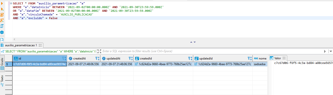SELECT * FROM "auxilio_parametrizacao" "a" WHERE "a"."dataInicio" BETWEEN '2021-09-02T00:00:00.000Z' AND '2021-09-30T23:59:59.000Z' OR "a"."dataFim" BETWEEN '2021-09-02T00:00:00.000Z' AND '2021-09-30T23:59:59.000Z' AND "a"."vinculoChamada" = 'AUXILIO_PUBLICACAO' AND "a"."excluido" = false