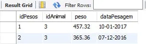 O que eu estou buscando é “Selecione Tudo da tabela Pesos onde o idAnimal seja igual ao id no caso id = 3”
