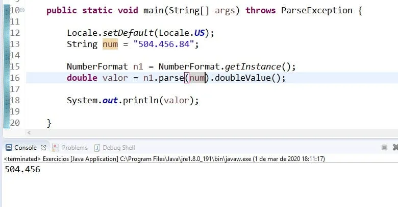 importjava.util.Scanner;importjava.util.Locale;importjava.text.NumberFormat;publicclassTesteDeFormatoDeNumero{privateScannerentrada=newScanner(System.in);/* * Método para ler o valor */privateStringgetValor(){System.out.print("Informe o valor: ");returnentrada.next();}/* * Método para converter o padrão ###.###,## para o padrão ######.## da String */privateStringformatarPadraoUS(){StringpadraoUS_p1=getValor().replace(".","");StringpadraoUS_p2=padraoUS_p1.replace(",",".");returnpadraoUS_p2;}publicstaticvoidmain(String[]args){//Instancia da classe TesteDeFormatoDeNumeroTesteDeFormatoDeNumeroteste=newTesteDeFormatoDeNumero();//Obtém o valor Double da String retornada pelo método formatarPadraoUSDoublevalorInformado=Double.valueOf(teste.formatarPadraoUS());System.out.println("Original: "+valorInformado);/* * Obtém o valor monetário 'forçando' que se seja do Brasil. * 1 - format(Double d): formata o valor Double para String; * 2 - new Locale(String language, String country): instancia uma localização com os parâmetros de idioma (português) e país Brasil; * 3 - getCurrencyInstance(Locale locale): retorna o valor formatado na moeda do locale */StringvalorFormatado=NumberFormat.getCurrencyInstance(newLocale("pt","BR")).format(valorInformado);System.out.println("Formatado: "+valorFormatado);}}