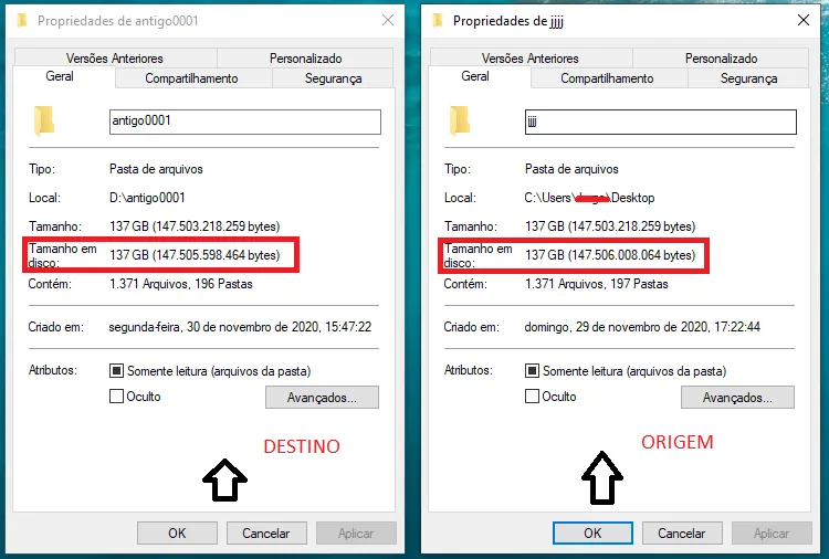 Eu copiei uma pasta com vários arquivos pra outra repartição. Quando clico em propriedades em “Tamanho” esta igual e em “Tamanho em disco” esta diferente e agora?