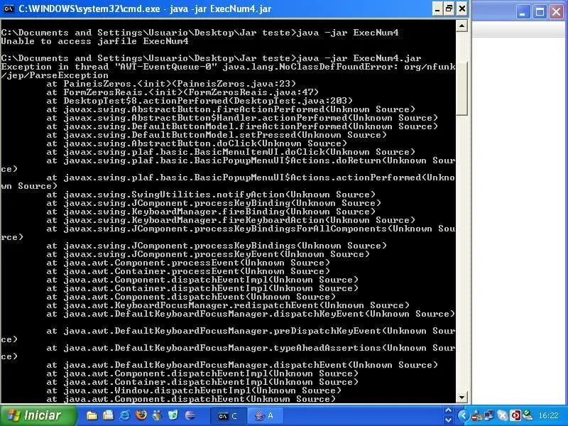 Ola a todos. Estou com o seguinte problema. Criei um arquivo jar pelo eclipse e quando vou executa-lo fora do ambiente do mesmo, ele abre normalmente e exibe os menus como deve ser feito no programa em questao. Ao clicar numa das opcoes do menu deste programa