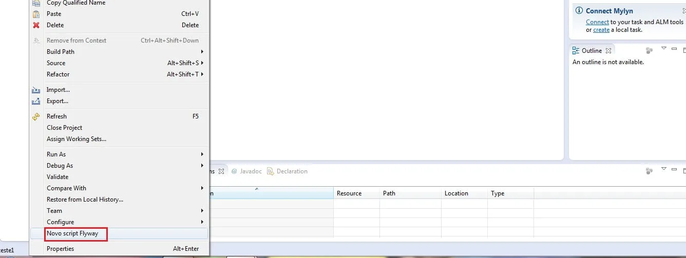 Agora, ao criar o arquivo, é gerado um erro dizendo que o resource não existe: [color=red]Resource ‘/teste/Users/joao/workspace/runtime-EclipseApplication/teste/src/migrations/1.4.0’ does not exist[/color]