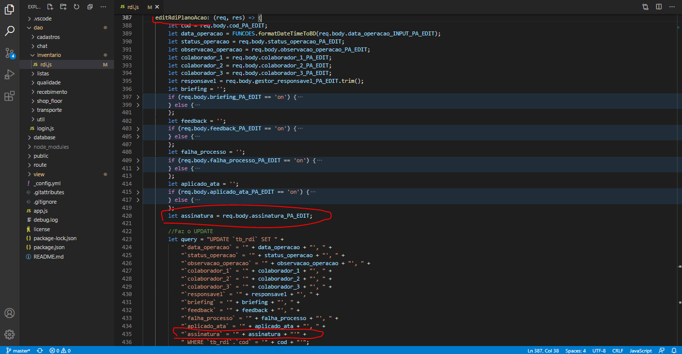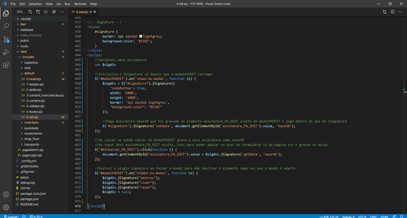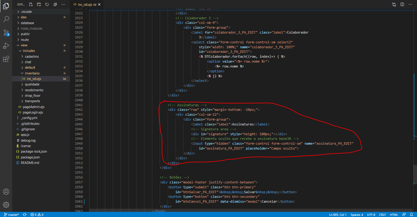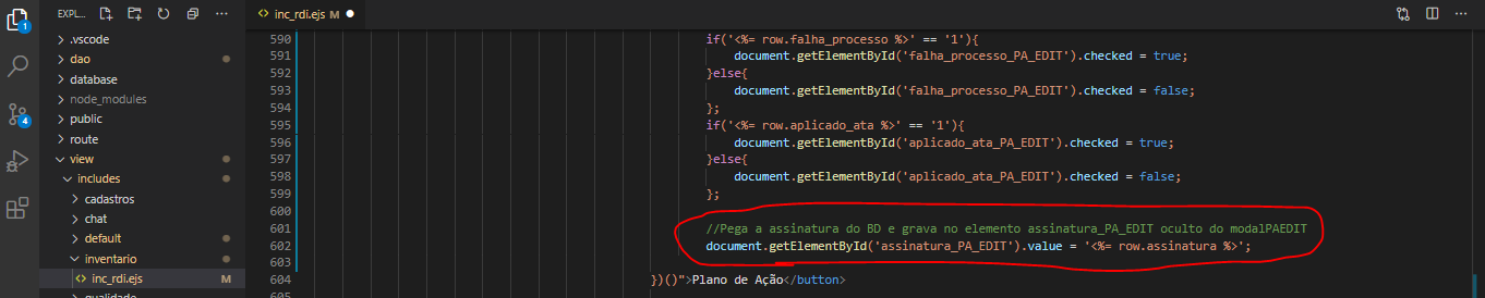 Bom, neste modal ao salvar, faz um post e envia o conteúdo do elemento oculto “assinatura_PA_EDIT” para o req.body que é recebido pela rota que faz o Updade: