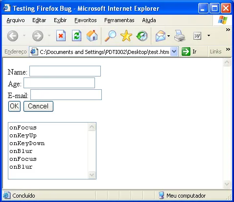 Fiz um exemplo com um simples HTML e um formulário, onde um dos campos possui tratamente dos eventos (onBlur, onFocus, etc). O IE (6.0.2900.2180 SP2) e o Firefox (2.0.0.9) se comportam de maneira diferente.