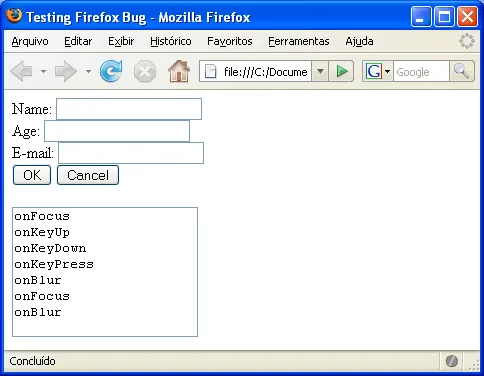4) Click com o mouse sobre o campo Age (onFocus - ambos)