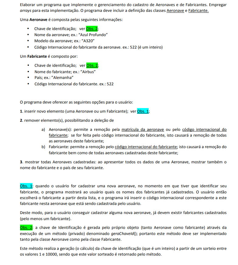 https://www.guj.com.br/u/soke no início é difícil, mas é assim msm :D. Então cara tu vai ter que estudar orientação a objetos, entender o q é uma classe e uma associação. Vejo aqui q vc vai ter uma classe Aeronave, outra Fabricante e uma Classe Main onde exiba um menu para fazer o que o exercício lhe pede. Não esqueça de utilizar List em vês de arrays para deixar mais bonito e mostrar q vc é o cara.