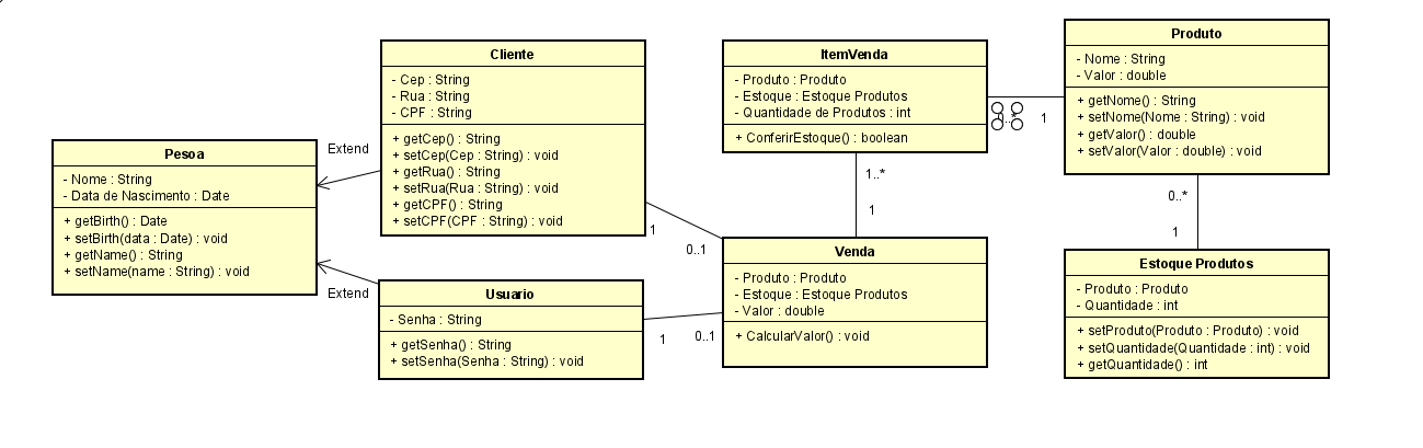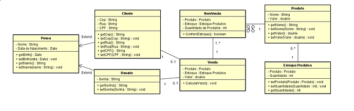 Pessoa tem dois “ésses”. Herança se representa com a seta de generalização, não de associação. É uma seta em que a ponta é um triângulo e a linha não é pontilhada. Vc está usando o Astah, não vai ser difícil de achar. Alguns relacionamentos estão estranhos, pq vc indica a composição dentro das classes, o que é na vdd subentendido pelas associações e a multiplicidade parece estar errada tbm… As associações eu normalmente opto em utilizar associações navegáveis, pois vc pode indicar qual atributo dentro da classe que materializa aquele relacionamento. Muita coisa tbm, só da pra saber se está certo ou errado lendo os seus requisitos…
