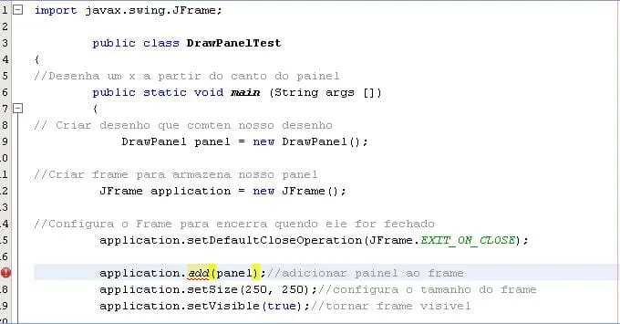 import javax.swing.JFrame;public class DrawPanelTest{ public static void main (String args []) { DrawPanel panel = new DrawPanel();JFrame application = new JFrame(); application.setDefaultCloseOperation(JFrame.EXIT_ON_CLOSE); :oops: application.add(panel);//adicionar painel ao frame application.setSize(250, 250);//configura o tamanho do frame application.setVisible(true);//tornar frame visivel}