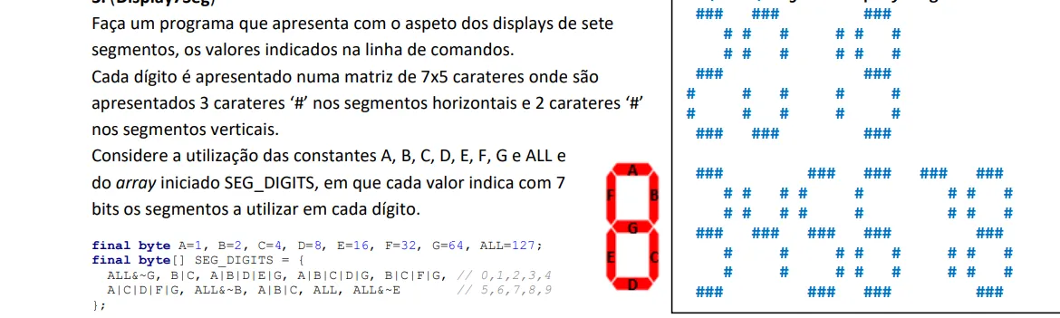 “Faça um programa que apresenta com o aspeto dos displays de sete segmentos, os valores indicados na linha de comandos. Cada dígito é apresentado numa matriz de 7x5 carateres onde são apresentados 3 carateres ‘#’ nos segmentos horizontais e 2 carateres ‘#’ nos segmentos verticais. Considere a utilização das constantes A, B, C, D, E, F, G e ALL e do array iniciado SEG_DIGITS, em que cada valor indica com 7
