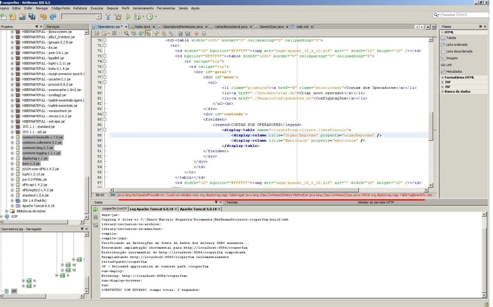 2 - Quando consegui colocar as bibliotecas pelo meio das PROPRIEDADES do meu projeto (NETBEANS) os jars, parecia estar vendo a luz no fim do tunel, pau, quando começo a digitar as TAGS display o netbeans reclama JAVA LANG not class found … putzzz nem o erro da para interpretar.