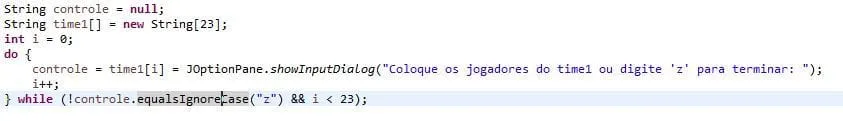 Stringcontrole=null;do{for(inti=0;i<22;i++){controle=time1[i]=JOptionPane.showInputDialog("Coloque os jogadores do time1 ou digite 'z' para terminar: ");}}while(!controle.equals("z"));
