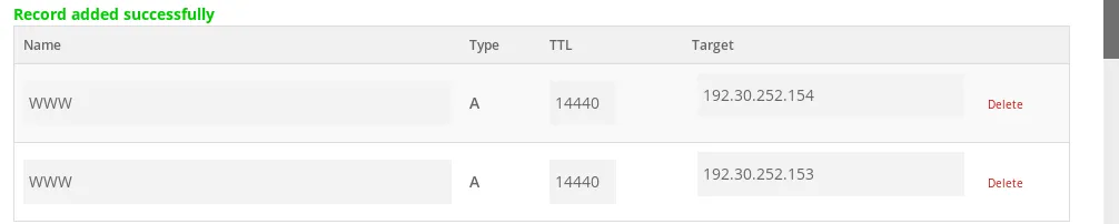 Cria os dois registros do tipo A para os IPs, mantendo o CNAME, e aguarda a propagação. Note que para o registro do tipo A, você não deve por o nome “WWW” na criação do registro, deixe vazio.