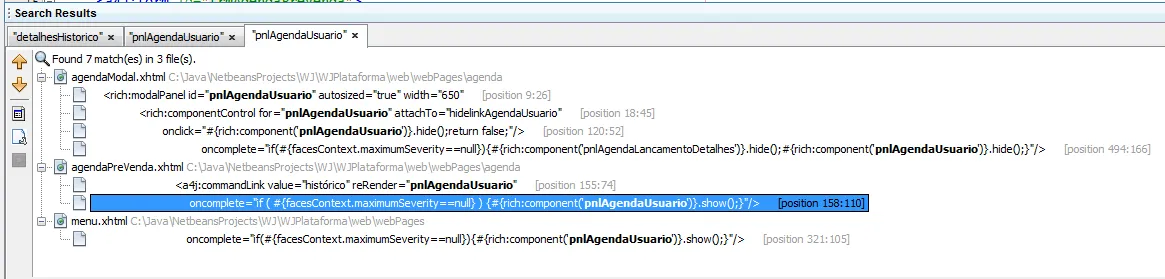 I’d like you please to look at the attachment, an image that displays the Search Results tab of the Netbeans IDE, informing all occurrences of the Id “pnlAgendaUsuario”.
