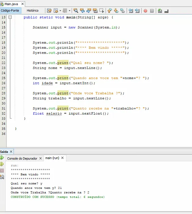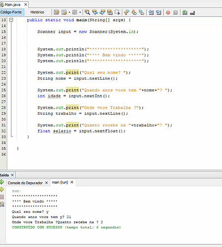 Bom dia, estou com um problema aqui e não sei se é no código pois procurei e não achei, sou iniciante do Java e estava apenas praticando com exercícios simples, com isso ele primeiro pedi o nome da pessoa, depois a idade, aí com isso ele deveria pedir o lugar onde trabalha, só que ele não pediu ele pula e vai para o salário da pessoa, queria saber o que tem de errado?