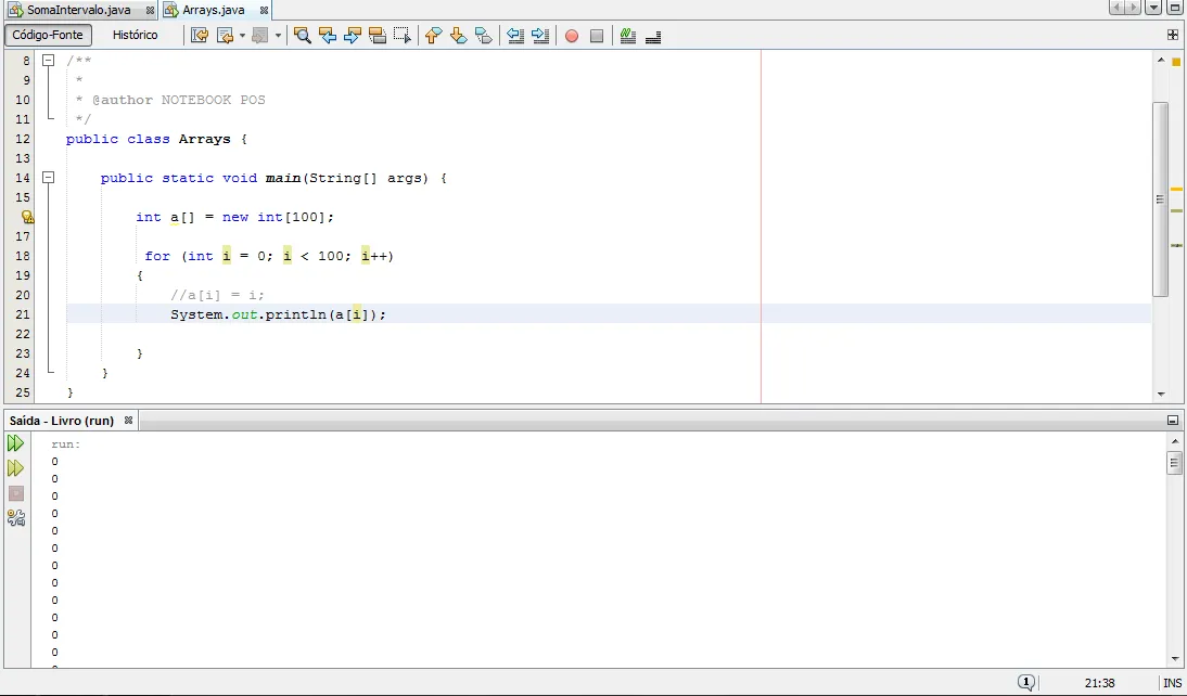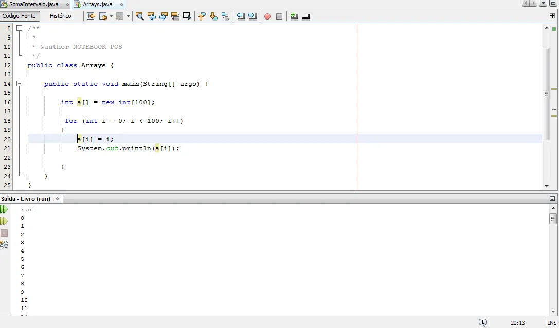 Boa tarde pessoal comecei a estudar Array em Java hoje porem estou com uma duvida, num array de 0 a 99 que peguei de exemplo.O codigo pra ele funcionar correto e o seguinte:
