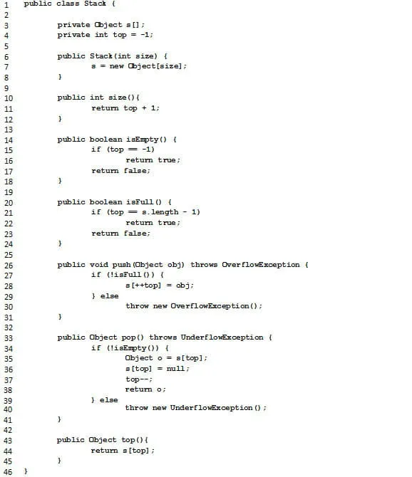 Caso a pilha já esteja cheia, uma exceção de overflow é lançada (linha 30). Caso a pilha não esteja cheia, o atributo top é incrementado e o objeto é inserido na pilha (linha 28).