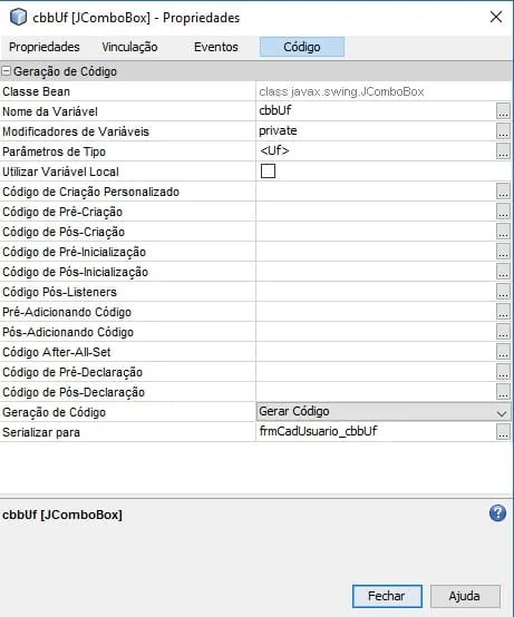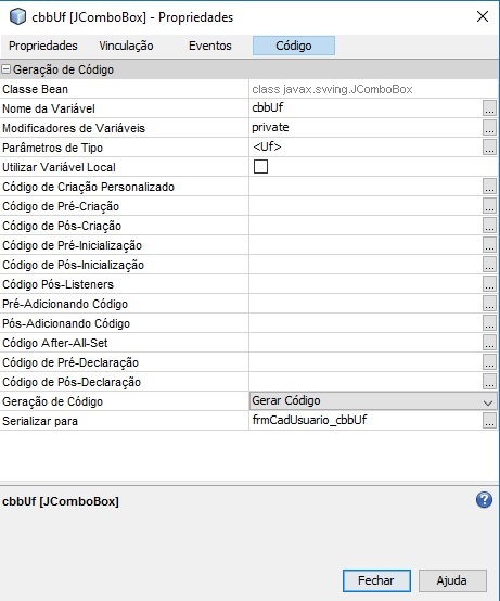 Tenho um Jcombobox cbbUf que é do tipo Uf, e queria setar a model dele para ficar assim – UF --, mas isso apenas da certo se meu Jcombobox for do tipo String. Segue abaixo a tela de propriedades do meu Jcombobox. " Onde está Parâmetros de Tipo porque meu Jcombobox é do tipo Uf, de um estado. SP, PR etc. Alguém pode me ajudar?