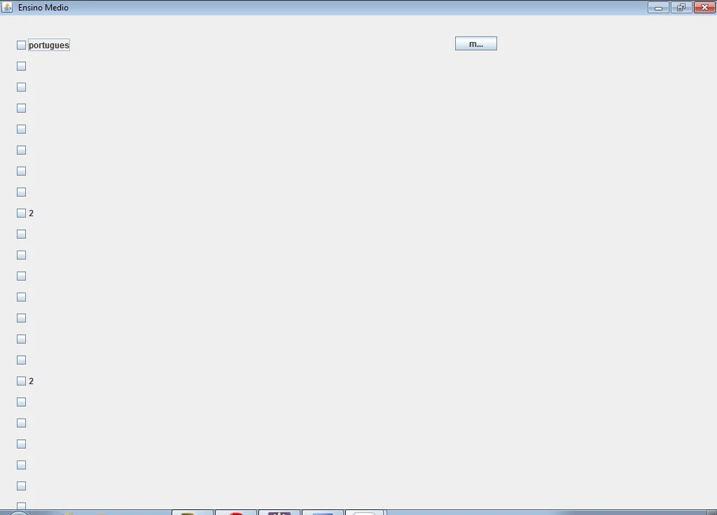 intq=0,k=0,j=20,h=150,u=30,z=0;Stringm[][]=null;//declaro minha matrizStringf=null,g=null;Stringv[]=newString[7];//declaro um outro vetor de string//aki é para ver a qntde de colunas que minha matriz m deve terSystem.out.println("select max(modulo) from disc_modulo ");resultado=comando.executeQuery("select max(modulo) from disc_modulo ");while(resultado.next()){f=resultado.getString(1);}q=Integer.parseInt(f);//aki é para ver a qntde de linhasresultado=comando.executeQuery("select distinct Id_disciplina from disc_modulo");while(resultado.next()){if(resultado.getString(1)!=null){v[k]=resultado.getString(1);//preencho o vetor v com o nome das disciplinask++;}}m=newString[q+1][k];//instancio minha matrizfor(inti=0;i<v.length;i++)//faço um for para percorrer meu vetor v e adiciona seus objetos na coluna 1 da matriz{System.out.println("select modulo from disc_modulo where ensino='"+1+"'and Id_disciplina='"+v[i]+"'");resultado=comando.executeQuery("select modulo from disc_modulo where ensino='"+1+"'and Id_disciplina='"+v[i]+"'");while(resultado.next()){if(v[i]!=null)m[i][i]=v[i];if(i<=q&&i>0){m[i][i]=resultado.getString(1);}}}//dimensiono e adiciono as checks na telafor(inti=0;i<m.length;i++)for(intp=0;p<m[i].length;p++){ck[i]=newJCheckBox();ck[i].setText(m[i][p]);ck[i].setBounds(j,u,h,25);j+=100;if(i==3||i==5||i==9){u+=30;j=20;tela.add(ck[i]);}if(m[i][p]!=null)tela.add(ck[i]);}}catch(Exceptione){e.printStackTrace();}