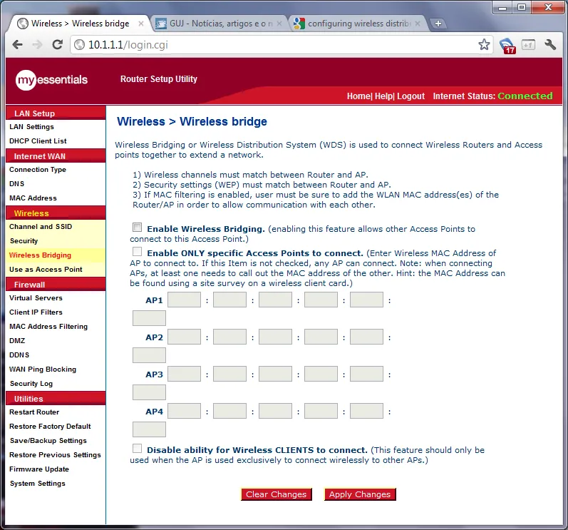 Acionei o WDS e Redirecionamento do DHCP no Linksys.
