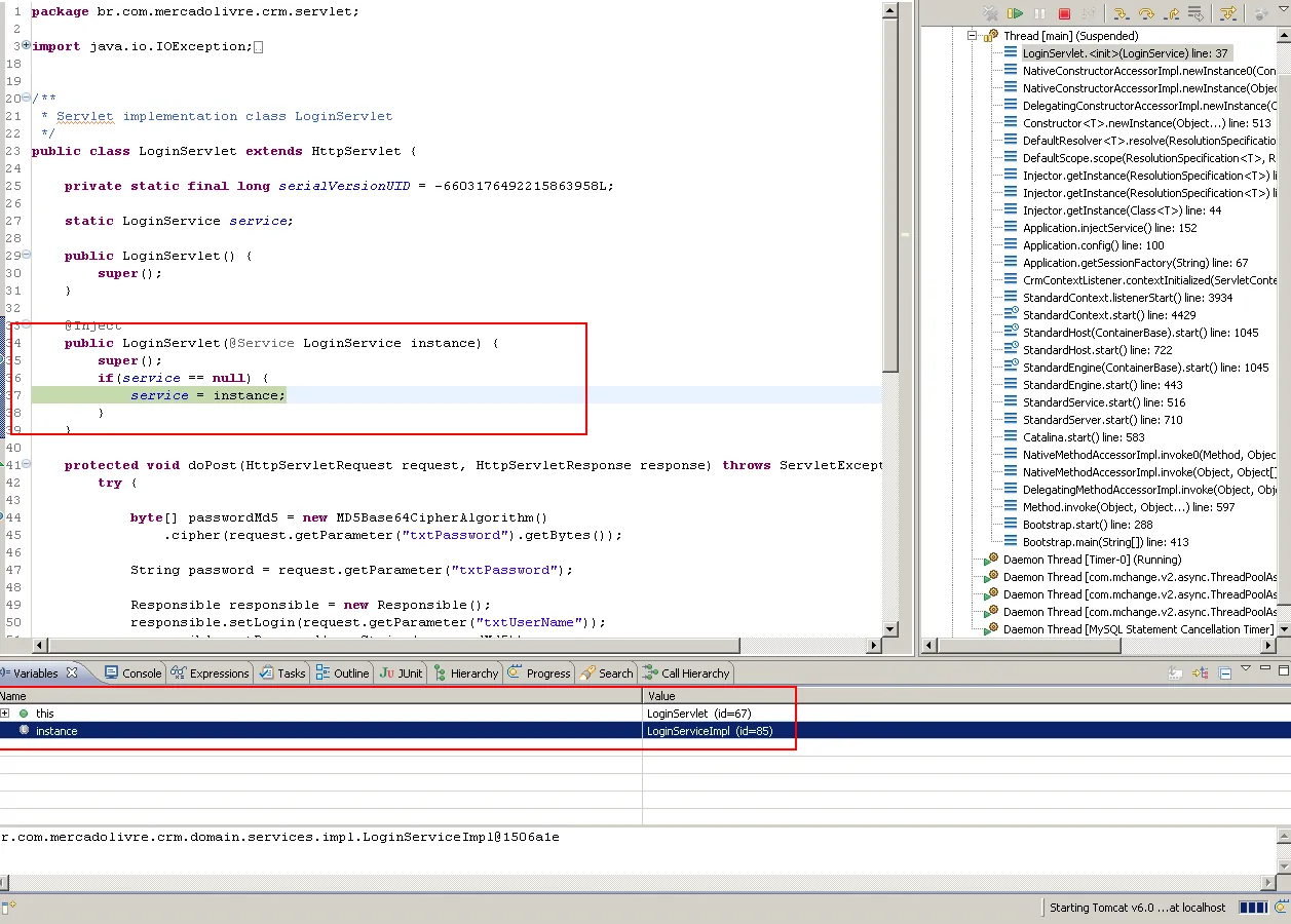 public class CaptureCasesServlet extends HttpServlet { private static final long serialVersionUID = 1L; static CatchInformationService service; public CaptureCasesServlet() { super(); } @Inject public CaptureCasesServlet(@Service CatchInformationService instance) { super(); if(service == null) { service = instance; } }Abraços