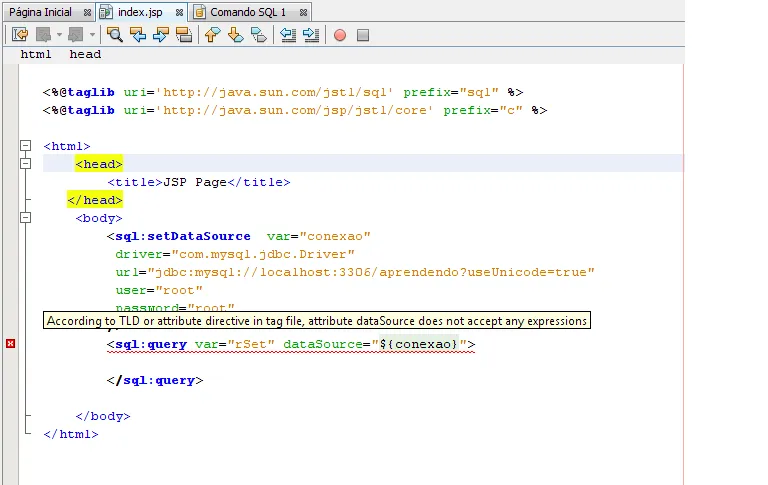 Estou usando assim, está bem semelhante ao site que sugeriram, mas mesmo assim continua exibindo a mensagem de erro como na imagem acima, se eu retirar a tag sql:query e mandar executar a página funciona normal então acredito que ao menos a tab sql:setDataSource está configurada corretamente.