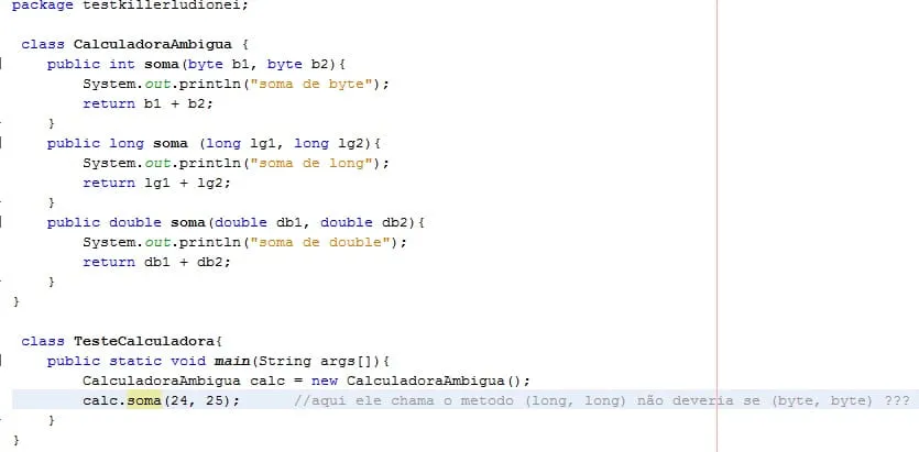 CalculadoraAmbiguacalc=newCalculadoraAmbigua();calc.soma(24,25);//aqui ele chama o metodo (long, long) não deveria se (byte, byte) ???