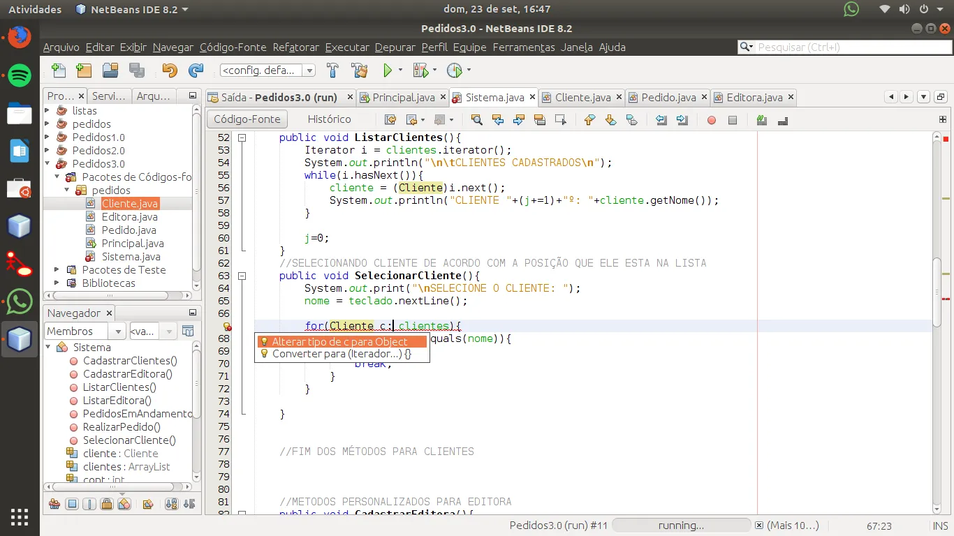 outra dúvida q estou tendo, é que o seguinte vou cadastrar os clientes e depois as editoras, e quando eu for fazer um pedido eu tenho q seleciona o cliente q irá fazer o tal pedido e como estou usando arrayList estou ficando um pouco perdido, na minha classe Sistema criei os seguintes métodos
