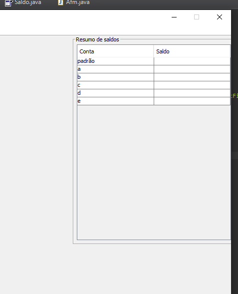 private DefaultTableModel dtm = new DefaultTableModel(new Object[][] {}, new String[] {“Conta”, “Saldo”});
