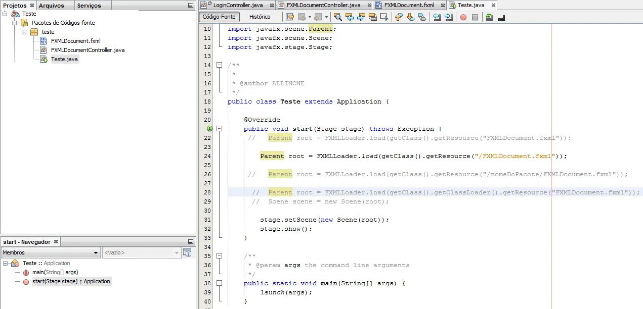 Exception in Application start method java.lang.reflect.InvocationTargetException at sun.reflect.NativeMethodAccessorImpl.invoke0(Native Method) at sun.reflect.NativeMethodAccessorImpl.invoke(NativeMethodAccessorImpl.java:62) at sun.reflect.DelegatingMethodAccessorImpl.invoke(DelegatingMethodAccessorImpl.java:43) at java.lang.reflect.Method.invoke(Method.java:497) at com.sun.javafx.application.LauncherImpl.launchApplicationWithArgs(LauncherImpl.java:389) at com.sun.javafx.application.LauncherImpl.launchApplication(LauncherImpl.java:328) at sun.reflect.NativeMethodAccessorImpl.invoke0(Native Method) at sun.reflect.NativeMethodAccessorImpl.invoke(NativeMethodAccessorImpl.java:62) at sun.reflect.DelegatingMethodAccessorImpl.invoke(DelegatingMethodAccessorImpl.java:43) at java.lang.reflect.Method.invoke(Method.java:497) at sun.launcher.LauncherHelper$FXHelper.main(LauncherHelper.java:767) Caused by: java.lang.RuntimeException: Exception in Application start method at com.sun.javafx.application.LauncherImpl.launchApplication1(LauncherImpl.java:917) at com.sun.javafx.application.LauncherImpl.lambda$launchApplication6(LauncherImpl.java:182) at java.lang.Thread.run(Thread.java:745) Caused by: java.lang.NullPointerException: Location is required. at javafx.fxml.FXMLLoader.loadImpl(FXMLLoader.java:3207) at javafx.fxml.FXMLLoader.loadImpl(FXMLLoader.java:3175) at javafx.fxml.FXMLLoader.loadImpl(FXMLLoader.java:3148) at javafx.fxml.FXMLLoader.loadImpl(FXMLLoader.java:3124) at javafx.fxml.FXMLLoader.loadImpl(FXMLLoader.java:3104) at javafx.fxml.FXMLLoader.load(FXMLLoader.java:3097) at teste.Teste.start(Teste.java:22) at com.sun.javafx.application.LauncherImpl.lambda$launchApplication13(LauncherImpl.java:863) at com.sun.javafx.application.PlatformImpl.lambda$runAndWait6(PlatformImpl.java:326) at com.sun.javafx.application.PlatformImpl.lambda$null4(PlatformImpl.java:295) at java.security.AccessController.doPrivileged(Native Method) at com.sun.javafx.application.PlatformImpl.lambda$runLater5(PlatformImpl.java:294) at com.sun.glass.ui.InvokeLaterDispatcher$Future.run(InvokeLaterDispatcher.java:95) at com.sun.glass.ui.win.WinApplication._runLoop(Native Method) at com.sun.glass.ui.win.WinApplication.lambda$null9(WinApplication.java:191) … 1 more Exception running application teste.Teste C:\Users\ALLINONE\Documents\NetBeansProjects\Teste\nbproject\build-impl.xml:1051: The following error occurred while executing this line: C:\Users\ALLINONE\Documents\NetBeansProjects\Teste\nbproject\build-impl.xml:805: Java returned: 1 FALHA NA CONSTRUÇÃO (tempo total: 7 segundos)
