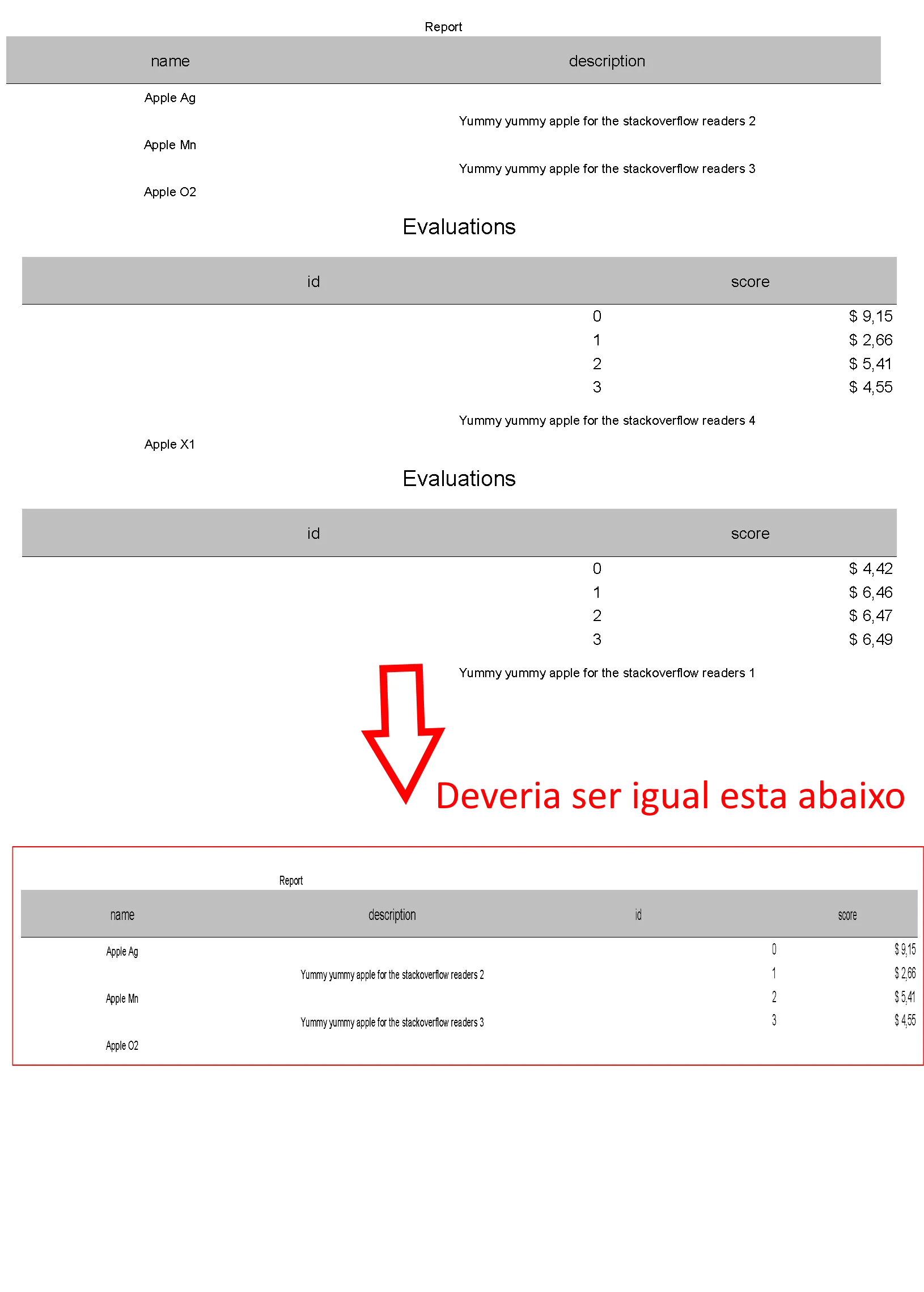 O código que eu tenho, imprime o subReport em outra linha. Fica bem feio e ruim, eu queria que o subreport ficasse em uma outra coluna na mesma linha. As imagens abaixo ilustram o problema: