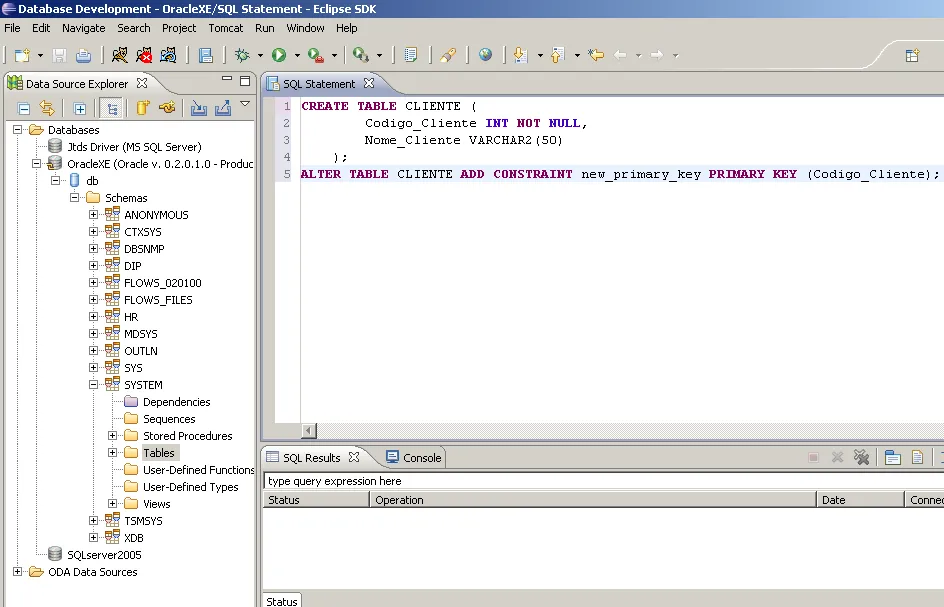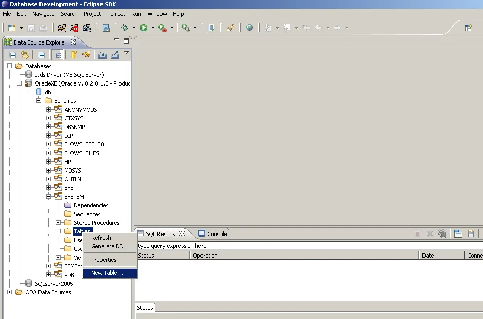 Estou tentando usar o Eclipse para criar tabelas no Oracle XE através da perspectiva Database Development.