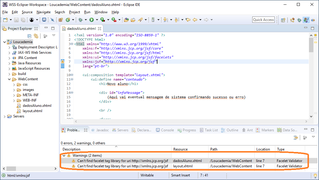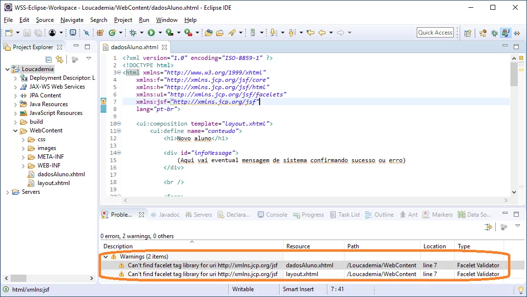 Estou recebendo a seguinte mensagem de erro no Eclipse: Can’t find facelet tag library for uri http://xmlns.jcp.org/jsf, conforme mostra a imagem a seguir: