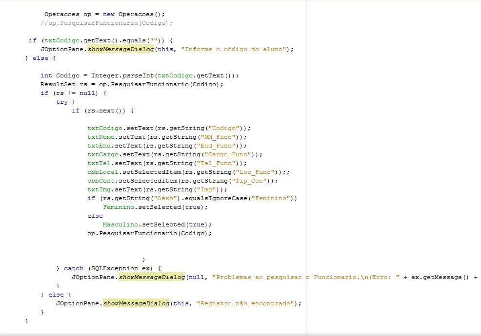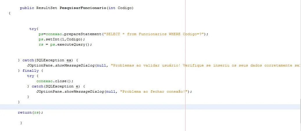 ResultSet rs = op.PesquisarFuncionario(Codigo);